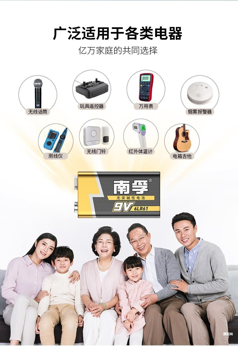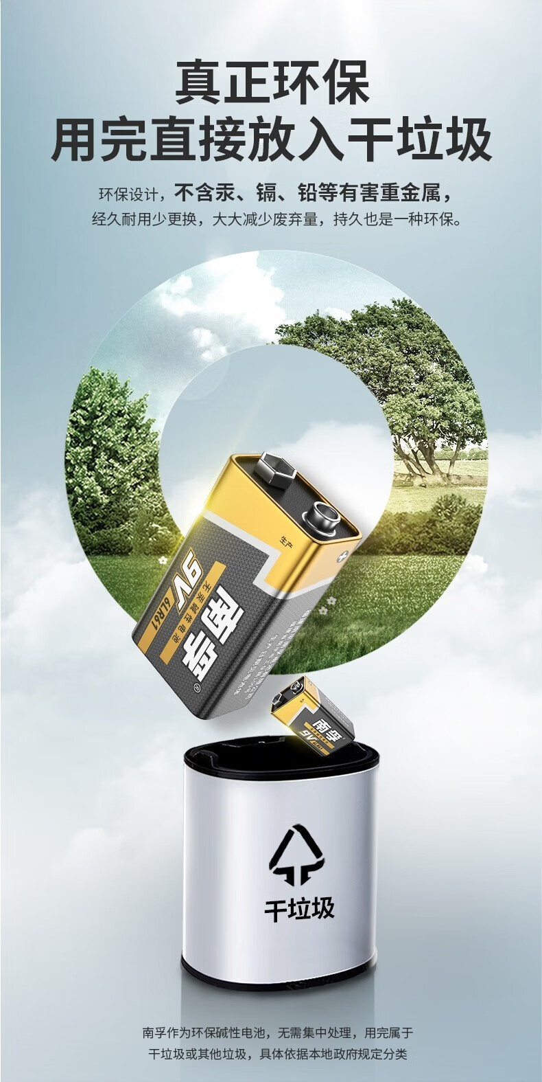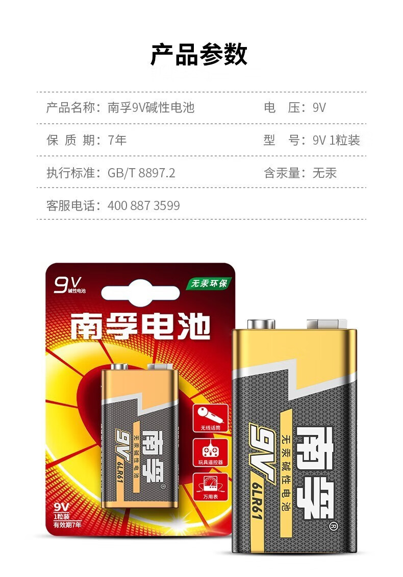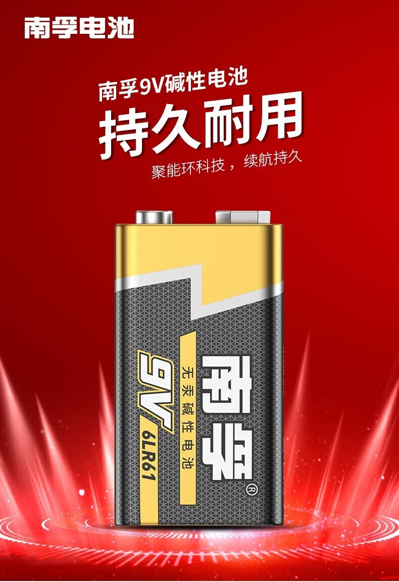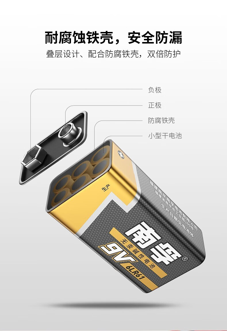 南孚 9V九伏堿性電池6F22萬(wàn)用表方塊電池6LR61適用于無(wú)線話筒/玩具遙控器/無(wú)線門鈴/煙霧報(bào)警 1粒裝-