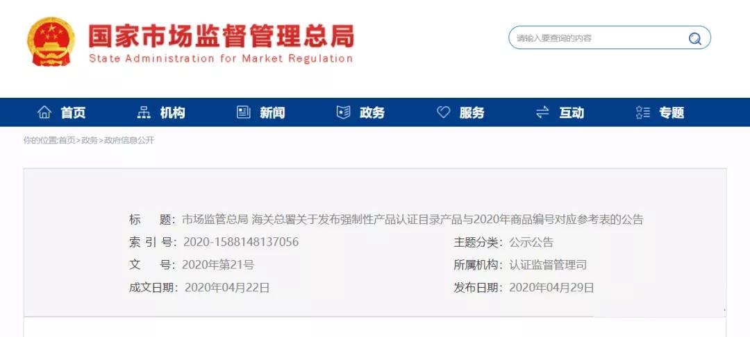 為進一步優化營商環境,便利強制性產品認證目錄內產品的進口貿易,提高監管效率,市場監管總局、海關總署編制完成《強制性產品認證目錄產品與2020年商品編號對應參考表》(以下簡稱《參考表》),現予發布。