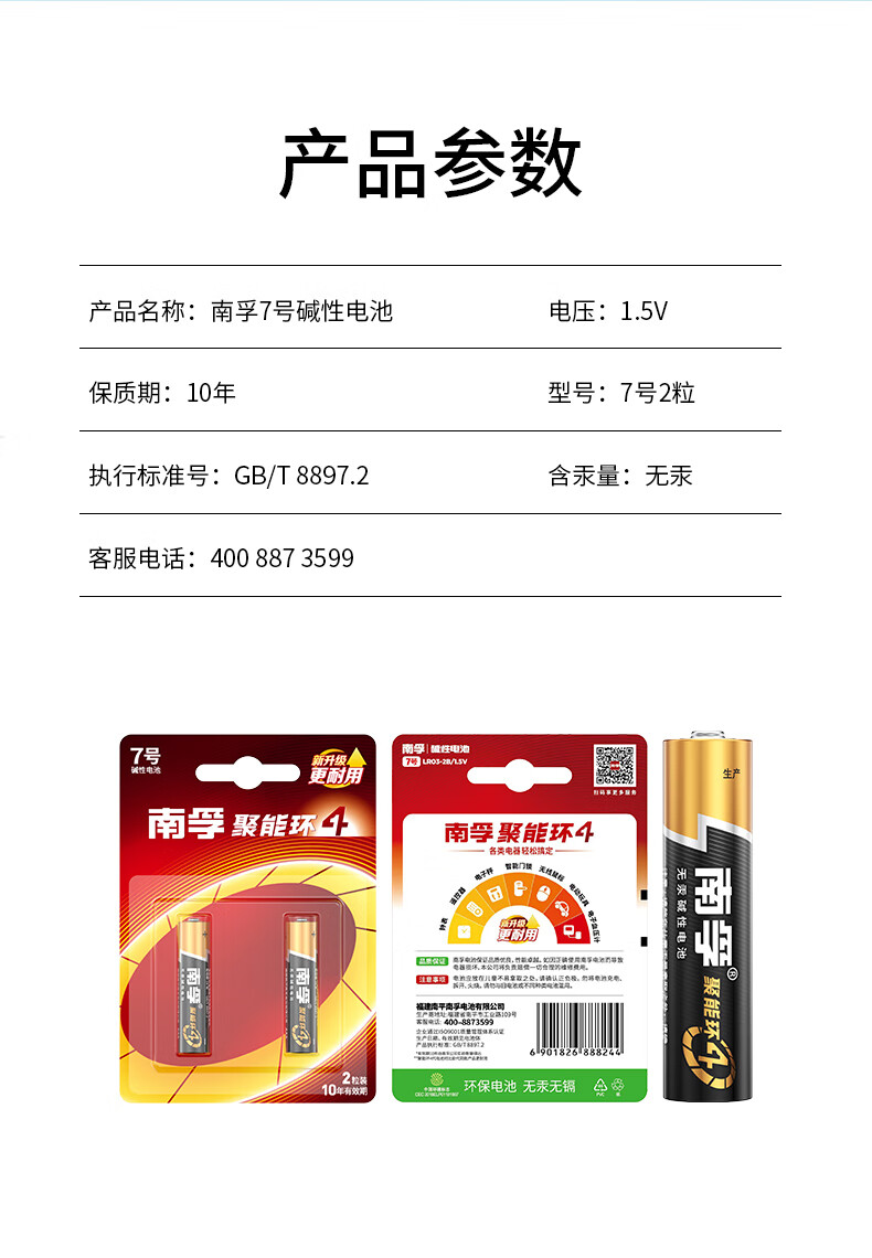 南孚(NANFU)7號電池2粒 七號堿性 聚能環(huán)4代 適用耳溫槍/血糖儀/無線鼠標/遙控器/血壓計/掛鐘等