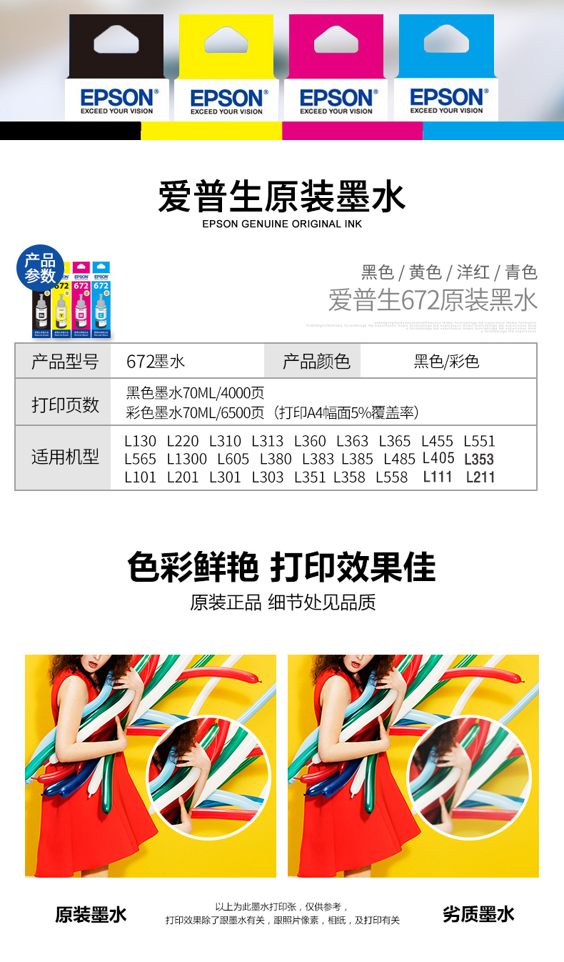 愛(ài)普生/EPSON T672 墨水/補(bǔ)充液/墨囊 原裝T6721墨水瓶適用L130/220/310/380/405/485/565/1300 墨倉(cāng)式打印機(jī)墨水T672黑色墨水