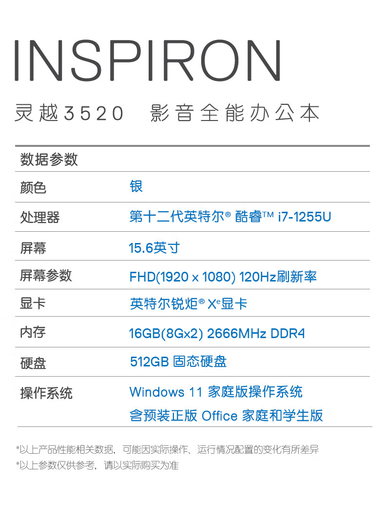戴爾dell靈越 便攜式計(jì)算機(jī)L3520 高性能全面屏輕薄本(12代i7 16G 512G 銳炬顯卡 120Hz防眩光高刷屏)15.6寸