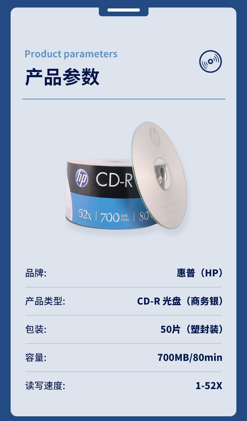 惠普(HP) CD-R光盤(pán)庫(kù)/刻錄光盤(pán)/空白光盤(pán) 52速700MB 50片/裝