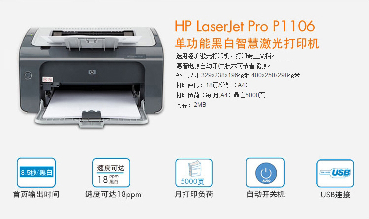 惠普(HP) P1106 A4黑白打印機 激光功能A41黑白打印 機